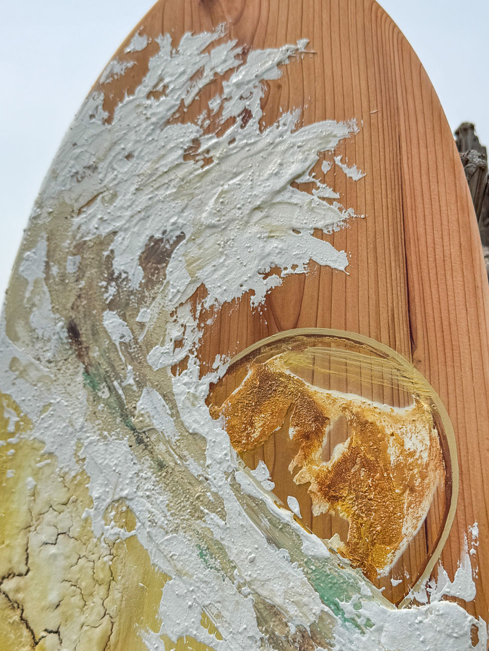 This mini decorative surfboard, The Big One, is our playful nod to the legendary West Coast tale of the “Big One” — the massive wave that coastal lore says may one day arrive. Crafted from sustainably sourced Vancouver Island Red Cedar, the board blends natural wood grain with layered acrylic and textured detailing to evoke the raw energy of a powerful ocean swell.